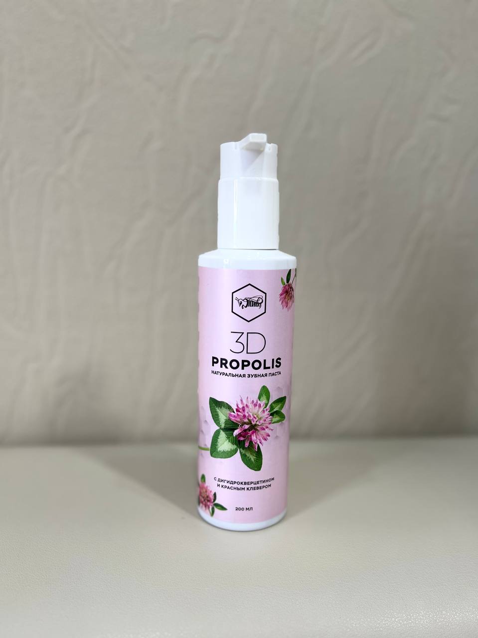 Натуральная зубная паста премиум-класса «3D Propolis» с дигидрокверцетином и красным клевером создана на основе природных растительных и минеральных компонентов с применением передовых технологий и предназначена для комплексного ежедневного ухода за полостью рта. Это действительно оригинальная зубная паста, прекрасный вкус и запах которой, высокое качество, а также привлекательный вид не оставят равнодушными ценителей полезных натуральных продуктов.