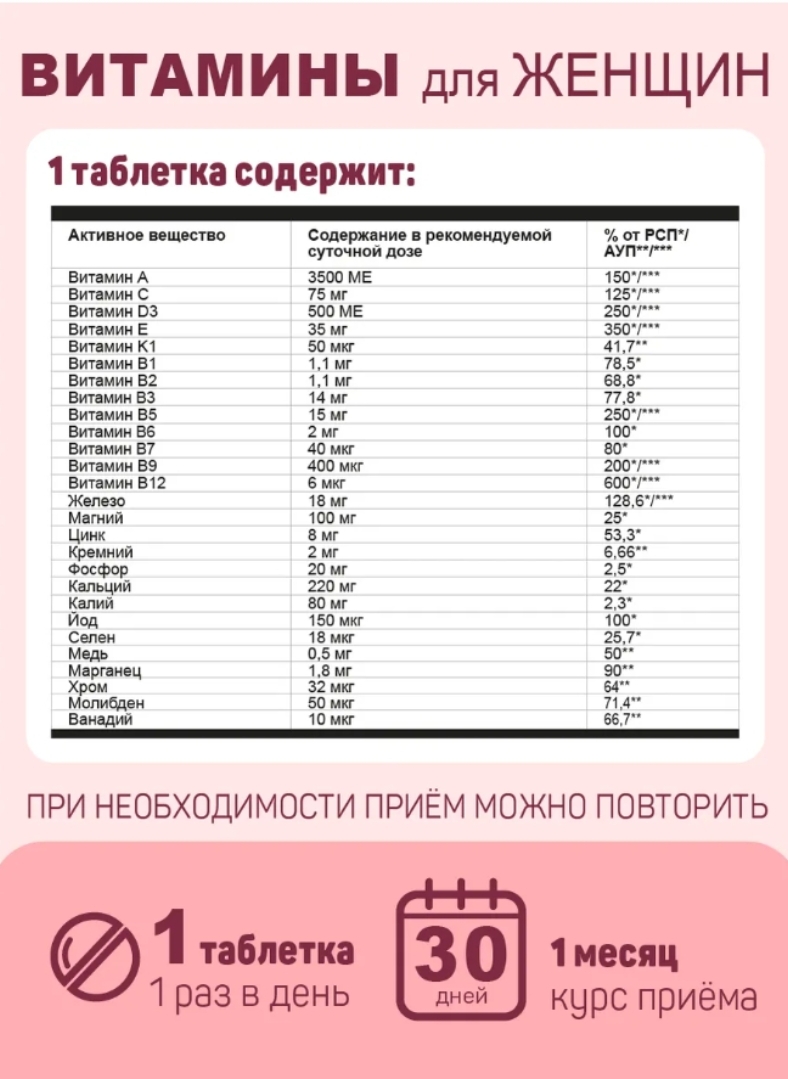 3500 МЕ 75 мг 500 МЕ 35 мг 50 мкг 1.1 мг 1.1 мг 14 мг 15 мг 2 мг 40 мкг 400 мкг 6 мкг 18 мг 100 мг 8 мг 2 мг 20 мг 220 мг 80 мг 150 мкг 18 мкг 0.5 мг 1.8 мг 32 мкг 50 мкг 10 мкг |